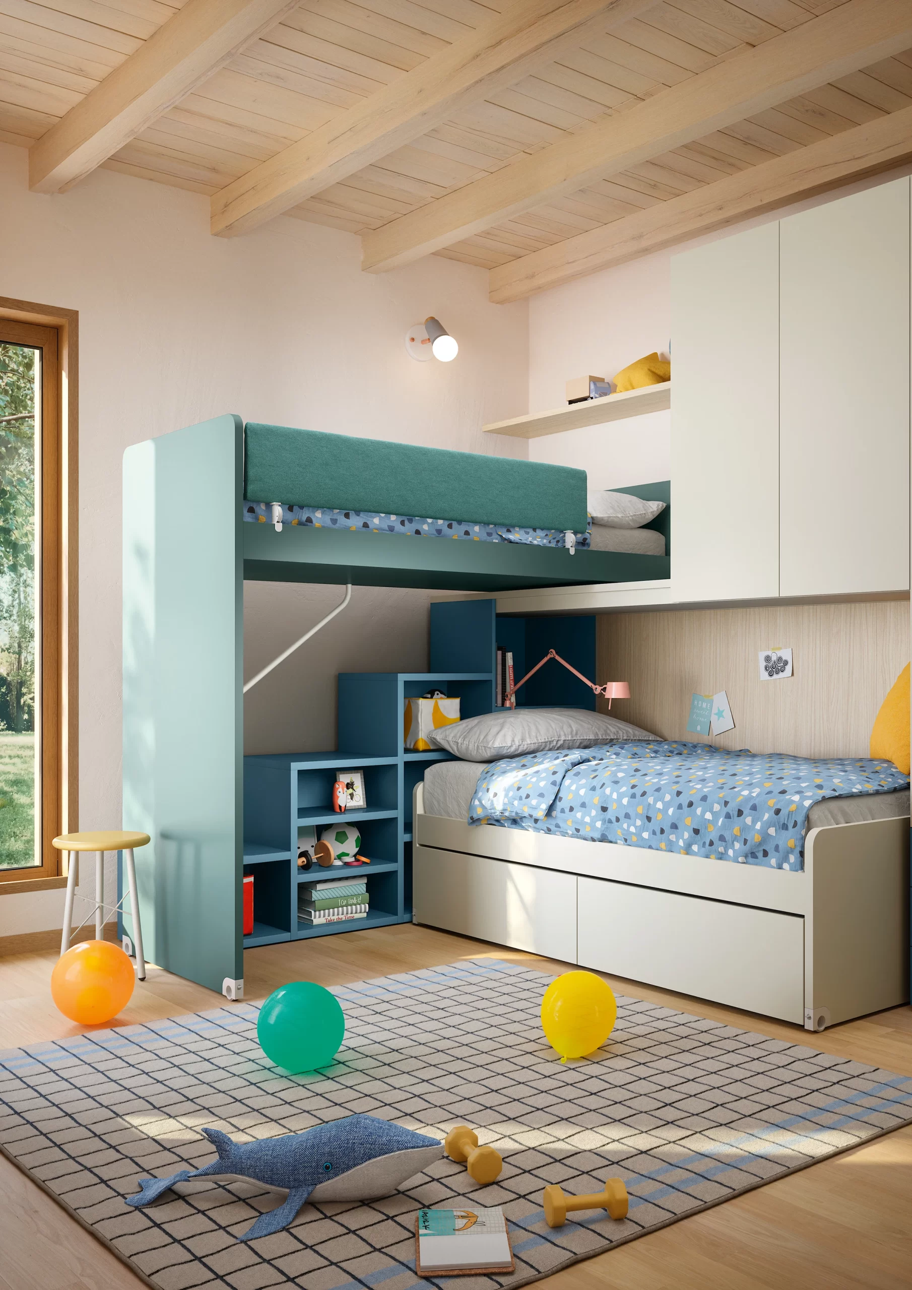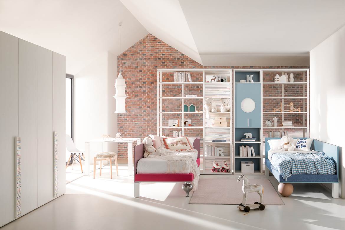 Letti a soppalco, soluzioni a ponte, composizioni salvaspazio e moduli trasformabili permettono di creare ambienti dinamici, pensati per evolvere insieme ai bambini.