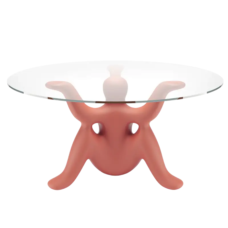 Il concept si distingue per la presenza di geni affascinanti con tre gambe e tre braccia che sorreggono i piani dei tavoli, quasi fossero a guardia della felicità della casa.