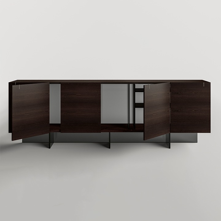 Ciò che rende questa madia davvero speciale è il suo basamento: non un semplice appoggio, ma un vero e proprio piano in vetro stratificato.